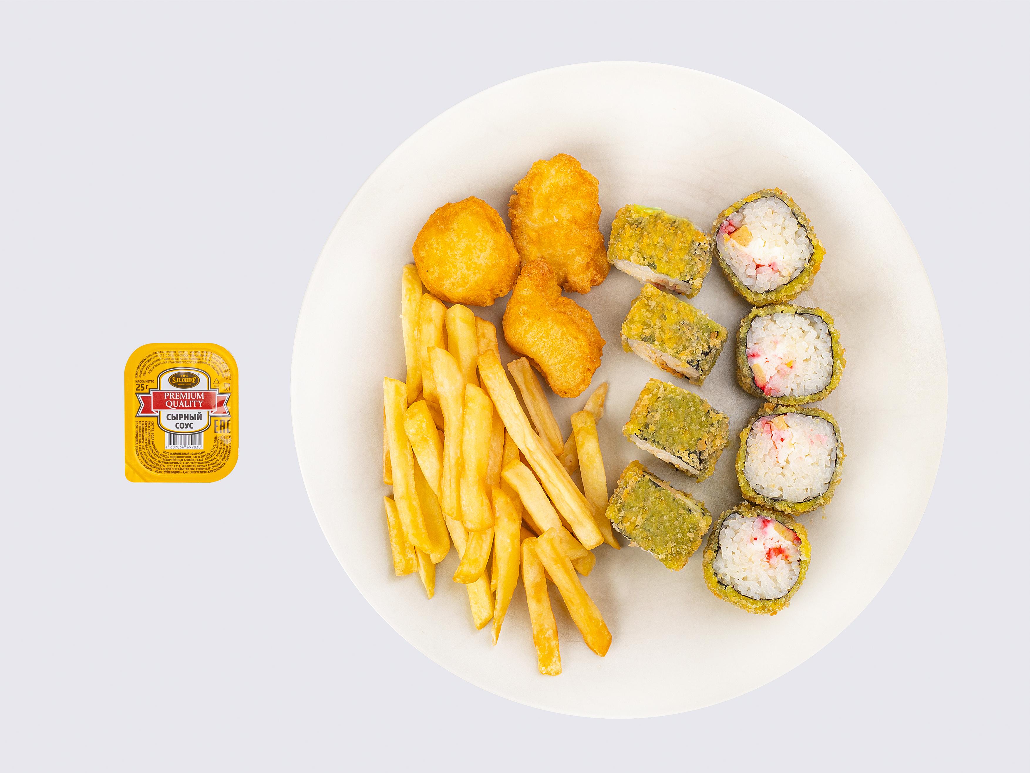 Жареный ролл Кани темпура 1/2, Жареный ролл Игаяки темпура 1/2, Наггетсы 3 шт, Картошка фри 1/2, Сырный соус