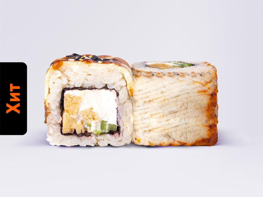 Угорь, сыр сливочный, японский омлет, соус унаги, огурец, кунжут