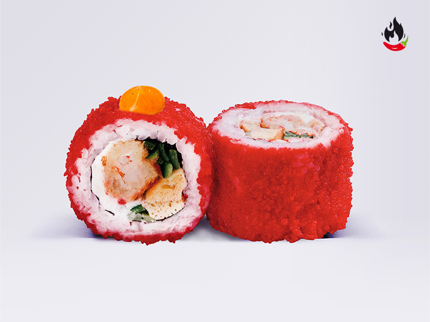 Креветка темпура, огурец, сыр сливочный, икра масаго, соус спайси