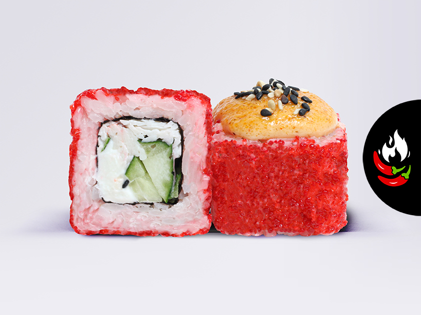 Снежный краб, сыр сливочный, огурец, сыр моцарелла, соус спайси, икра масаго, кунжут