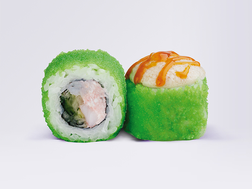 Риет из краба, креветка, икра масаго, огурец, фирменный соус с угрем и курицей, соус лемонграсс