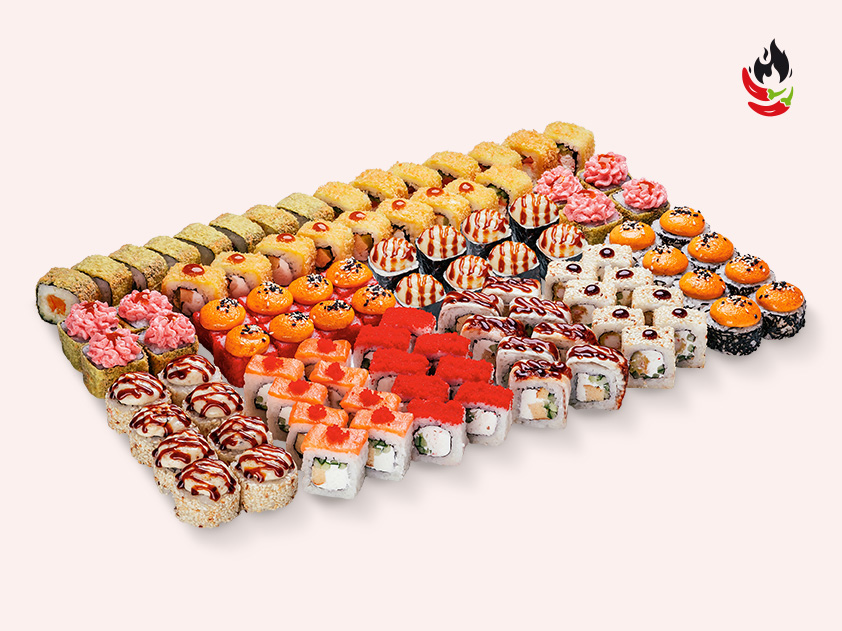 Роллы: Филадельфия с угрём, Камчатка, Сяке-тобико маки, Годзилла. Запечённые: Огненный дракон, Мидийный, Калифорния, мини-ролл Чиз лосось. Жареные: Лава темпура с крабом, мини-ролл Сяке темпура маки, Акита, Дайкон