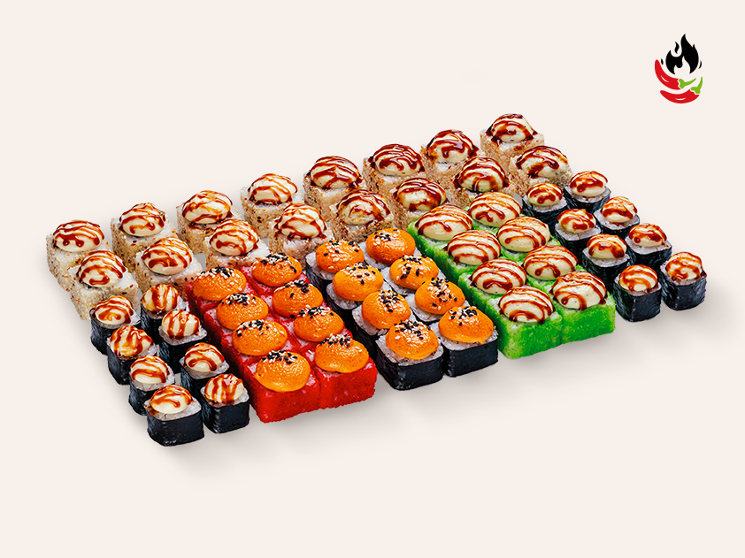Запечённые: Лососевый, Дубай, Чемпион, Калифорния, Огненный дракон, мини-ролл Томаго чиз, мини-ролл Чикен чиз