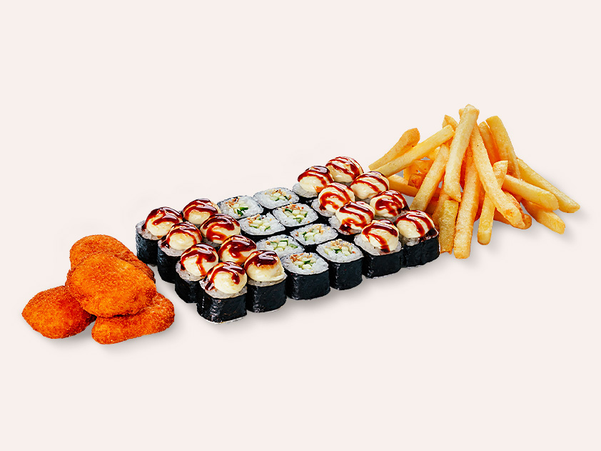 Ролл Каппа маки. Запечённые: мини-ролл Чикен чиз, мини-ролл Томаго чиз. Картофель фри, Наггетсы 5шт
